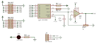 Otro modulo mas para la Multiboard-Pic Trainer, es un modulo DAC, convertidor Analógico a Digital. El modulito es bastante sencillo, el Integrado a usar es el DAC0808 y un pequeño Opam el famoso 741. Lista de Materiales:DAC0808. LM741. 2 Resistencias 4. 7 K. 1 Resistencia 330. 1 Trimmer 10 k. 1 Capacitor 15pF. Tira de pines Dobles y simples. 1 Led.Esquemático: