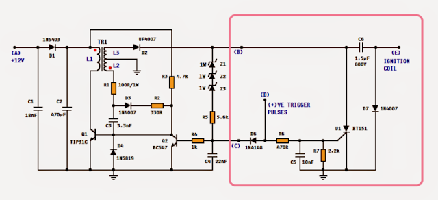 The circuit presented here is for a DC-CDI which are used in motorcycles. A DC-CDI is the one in which the high voltage (200-400VDC) is converted from 12V supply voltage. Researched and Submitted by: Abu-Hafss Studying the circuit, we see that it has two parts i. e. the CDI unit, enclosed in the pink box and the remaining circuit on the left is high voltage converter.